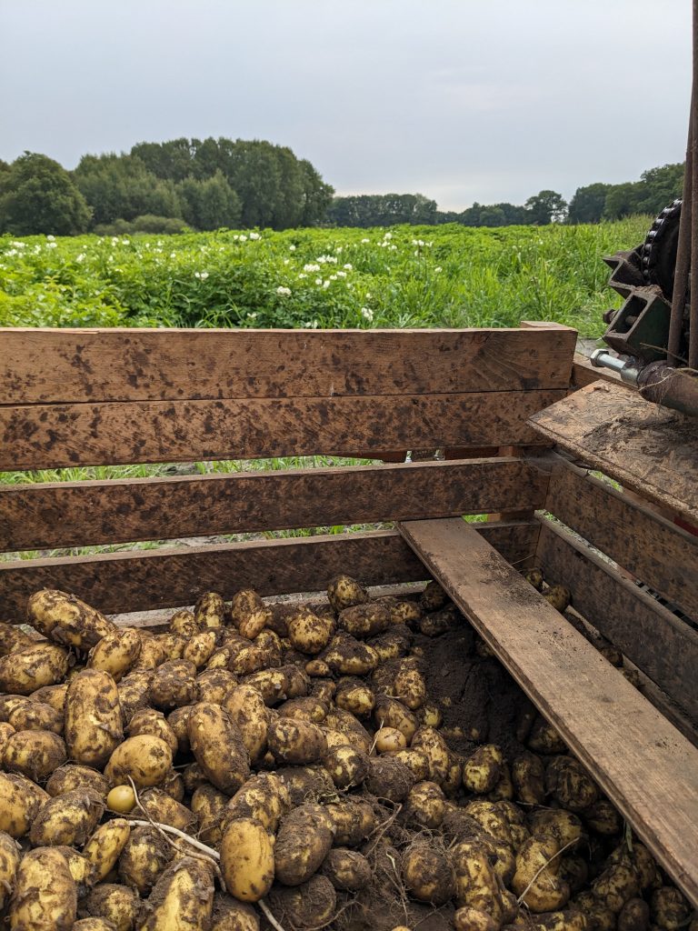 Endlich gibt es neue Kartoffeln! Wir fahren alle paar Tage mit dem kleinen Roder los, um für euch frische Kartoffeln zu holen. Die sind noch nicht schalenfest, das heißt, man kann sie nicht gut lagern – daher bitte in wenigen Tagen verspeisen 🙂 Ab September gibt es lagerfähige Kartoffeln. Dies ist übrigens GLORIETTA, festkochend, ganz ähnlich wie Belana. Lasst sie euch schmecken!